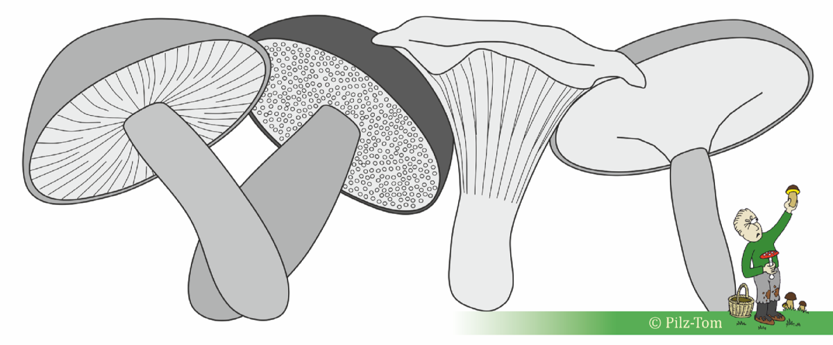 Die hier gezeigten Beispiele stellen die wohl wichtigsten Ordnungen für den Speisepilzsammler dar. Von links nach rechts sehen wir jeweils einen Vertreter der Egerlingsartigen, der Dickröhrlingsartigen, der Pfifferlingsartigen und der Stielporlingsartigen. Die Fruchträger treten hierbei in Form von Blättern, Röhren, Leisten oder Poren auf.