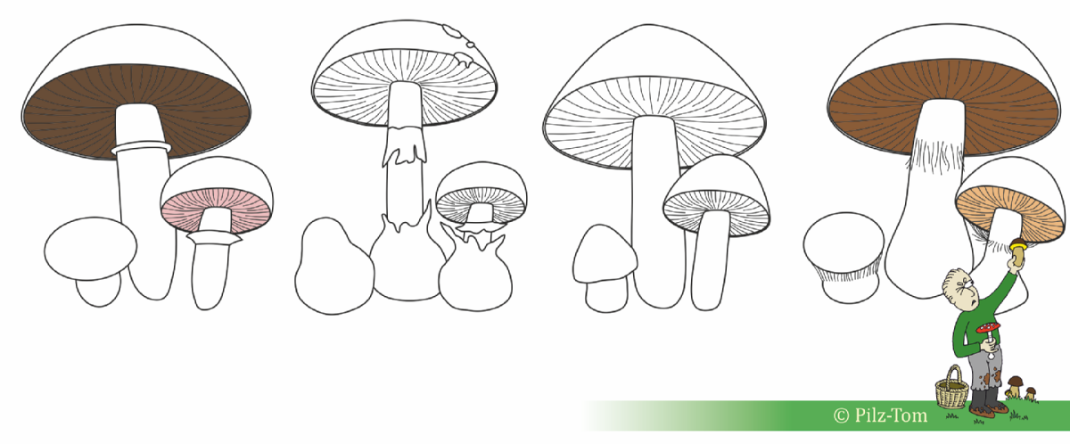 Einige der Familien der Egerlingsartigen sind, von links nach rechts, die Egerlingsverwandten, die Wulstlingsverwandten, die Ritterlingsverwandten und die Schleierlingsverwandten, jeweils repräsentiert durch ein typisches Exemplar. Nach den Familien schließlich kommen die Gattungen, unter denen wir endlich die einzelnen Arten finden. Ein Beispiel, wie dies aufgebaut ist, sieht wie folgt aus: