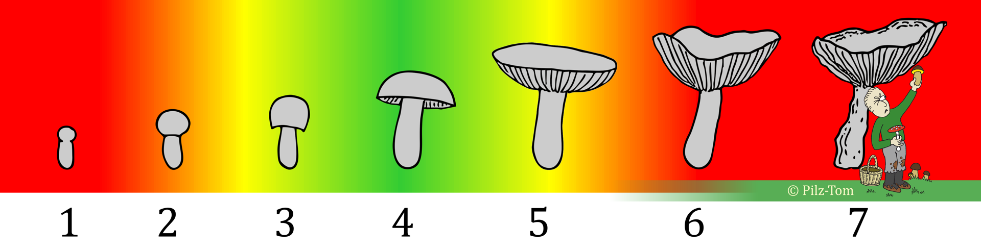 Nur die Stadien 3) und 4) sind zum Sammeln und Verzehren zu empfehlen. Stadium 5) ist noch bedingt zu verwenden. Ist der Pilz jünger, kann er leicht verwechselt werden. Die älteren Exemplare scheiden aus gesundheitlichen Gründen aus.