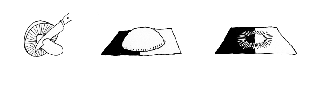 2) Den Hut legt man nun mit der Fruchtschicht nach unten auf ein Blatt Papier. Vorteilhaft ist es, wenn man zwei Hälften nimmt, die eine aus schwarzem, die andere aus weißem Fotokarton. So kann man später die Sporenfarbe einmal auf dunklem und einmal auf hellem Untergrund beurteilen. Damit die Lamellen das Papier nicht berühren, sollte man den Hut mit ein oder zwei Hölzchen am Rand unterlegen. Das Ganze wird nun, vor Zugluft geschützt, für ein paar Stunden abgelegt.